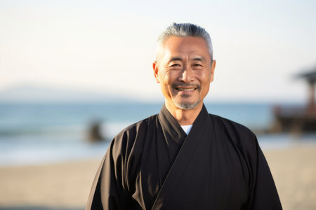 Portrait of happy senior Japanese man in traditional black kimono at beach