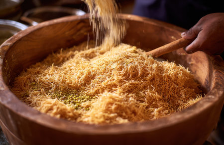 Chef hands working with raw shredded dough for kunafa dessert. Mixing ingredients in a rustic wooden container close up.
