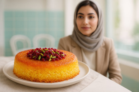 Colorful saffron rice topped with finely chopped pistachios is presented on a dark wooden platter. Surrounding elements add a traditional, cultural touch to the festive setup.