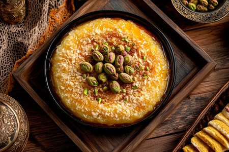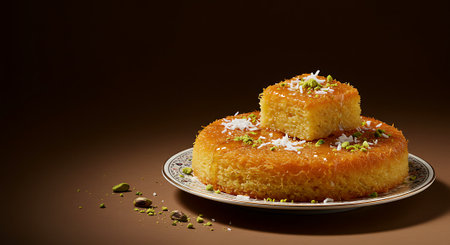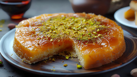 Traditional Semolina Cake Topped with Pistachios and Syrup