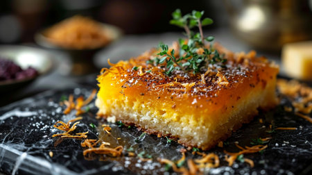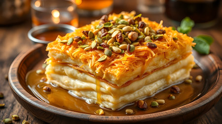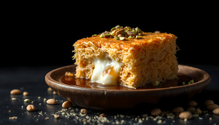 Kunafa, Middle Eastern delight. Golden strands of shredded phyllo dough hug a luscious layer of sweet cheese or semolina. Topped with syrup and nuts, a crispy, syrupy treat awaits.