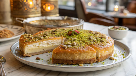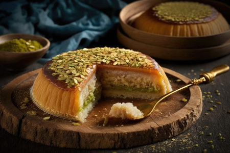 Traditional Turkish Dessert Kunefe with Clotted Cream and Crushed Pistachios.The image shows a portion of Kunefe, a traditional Turkish dessert.