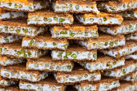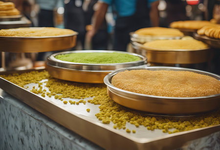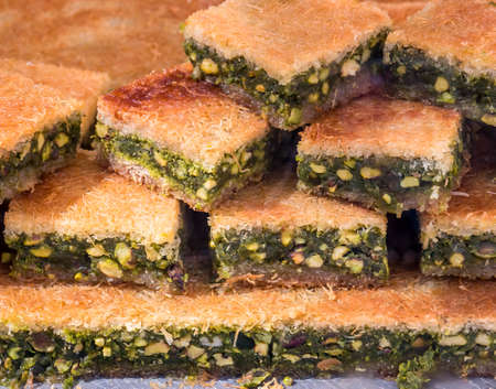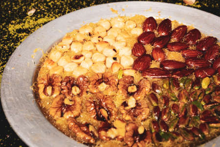 Traditional arabic and turkish sweets pastry dessert kadaif (kunafa, baklava), with peanuts, sold at local market