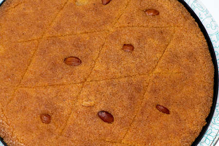Delicious turkish pastry with syrup revani over a white plate