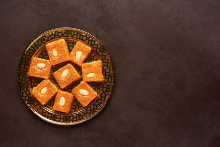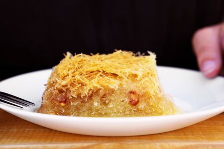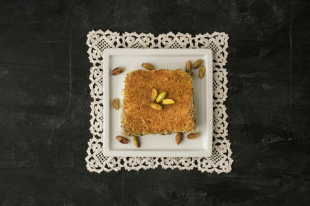 Traditional eastern dessert kunafa. Top view. Arabic cheese kunafa in white plate on dark wooden table with copy space. Konafa.