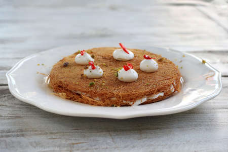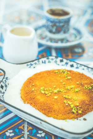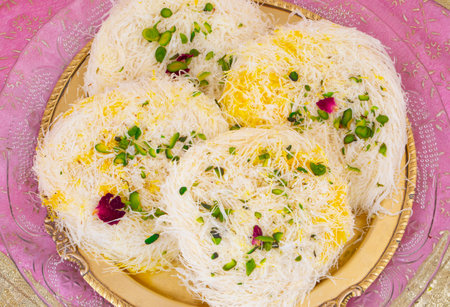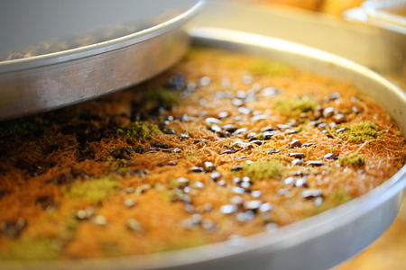 Knafeh or Kataif traditional Middle Eastern desert on a tray