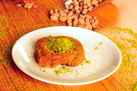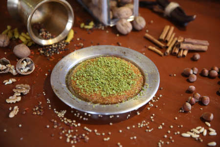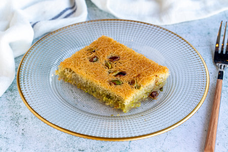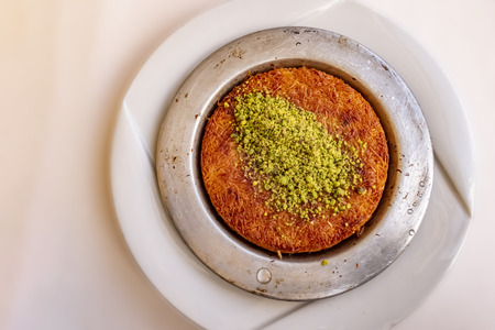 Turkish dessert kunefe, kunafa, kadayif with pistachio