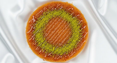 A close-up overhead view of a golden brown kunafa dessert, generously sprinkled with vibrant green crushed pistachios and drizzled with sweet syrup, presented on a luxurious white silk cloth.