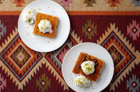 Turkish dessert kunefe served with ice cream on wooden background