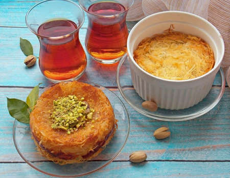 Turkish Kunefe dessert with cream and tea
