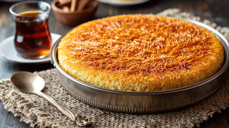 Fresh Kunafa Pastry Baking in Warm Studio Lighting with Cinnamon Finish