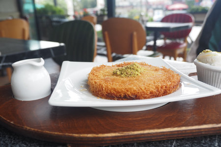 traditional turkish dessert kunefe with cream in white plate