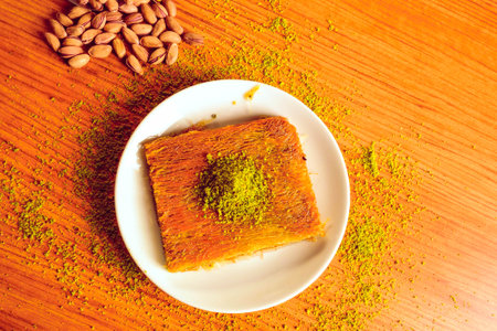 traditional Turkish dessert kadayif with pistachio on table with copy space