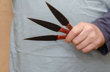 Black Throwing knives on camouflage cloth. Three special knives with red handles crossed. Military theme. View from above at an angle. Copy space.