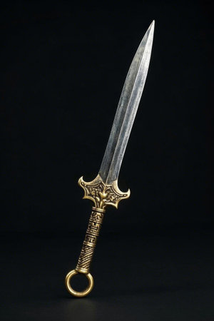 A beautifully crafted dagger featuring a sharp blade and ornate handle, resting elegantly on a textured fabric background with gold patterns.