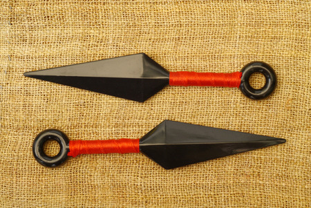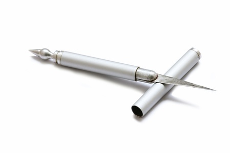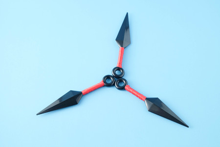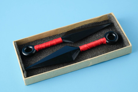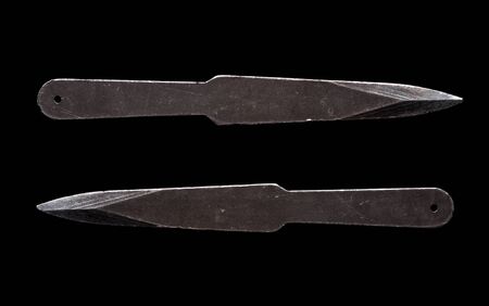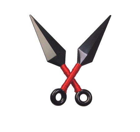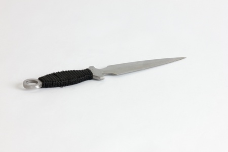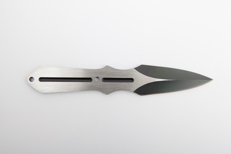knives, sharp ends and there is a black plastic handle is placed on the white background.