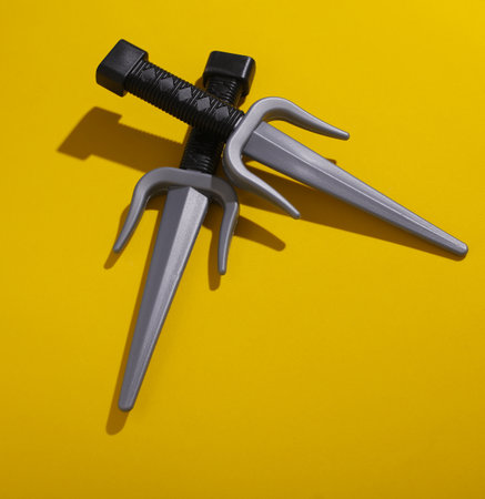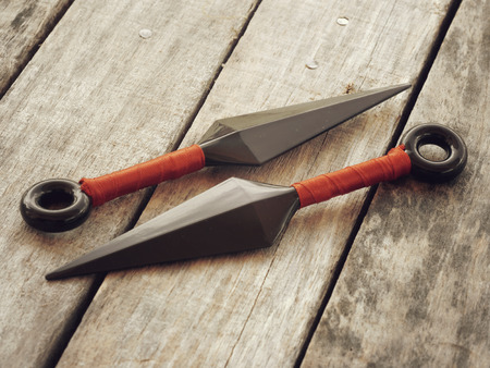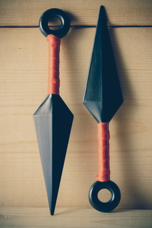 Closeup Ninja Star Shurikens with throwing spikes on Wooden Background