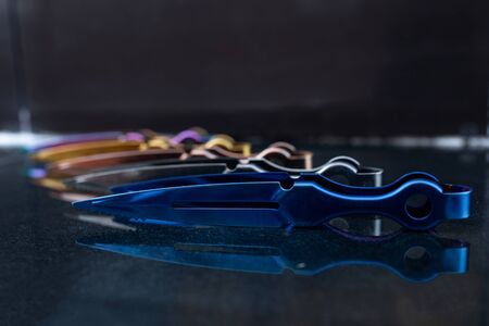 Kerambit dagger with a rainbow-colored blade on a dark textured background. Cold weapons, free space