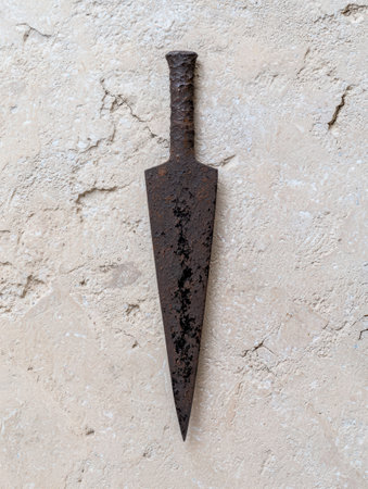 A striking dark blade rests on a textured surface, showcasing intricate details and a powerful design. Ideal for themes of fantasy and historical weaponry.