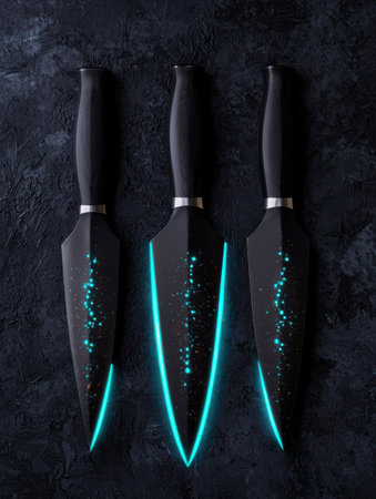 A close-up image showcases a futuristic dagger, rendered with detailed craftsmanship. The weapon features neon blue glowing accents against a dark background, creating a stark contrast. The composition highlights the sharp blade and intricate design elements. Suitable for various creative and illustrative applications, potentially for digital art or fantasy-themed projects.