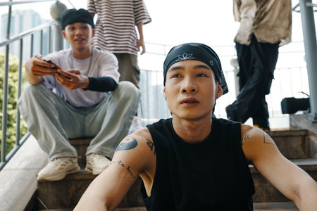 Close-up of a young asian man in casual clothing, looking pensive against a blurred urban background