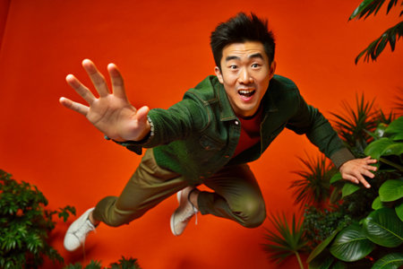Handsome young Asian man in green casual clothes jumping against red background