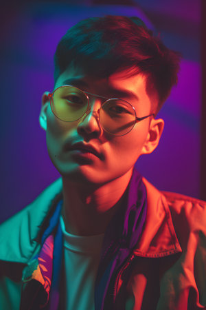 Portrait of young Asian man with eyeglasses in neon light.