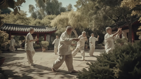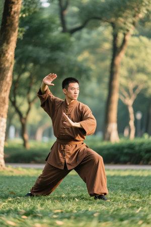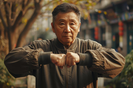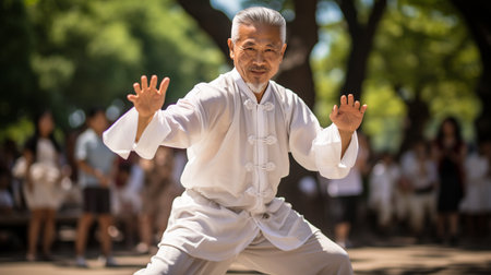 Senior asian man focuses intently while performing tai chi exercises in a peaceful outdoor setting