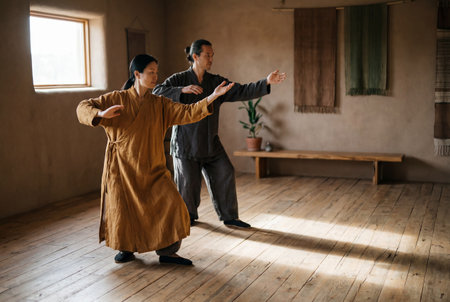An asian woman and man wearing traditional linen robes practice synchronized tai chi movements with focused expressions in a peaceful rustic room with warm sunlight and wooden flooring.