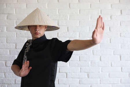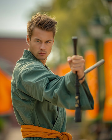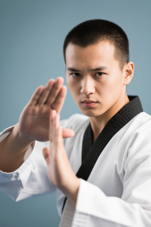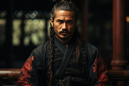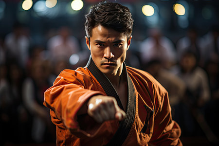 Master of kung fu in pose. Portrait of serious man of martial arts. Generative AI