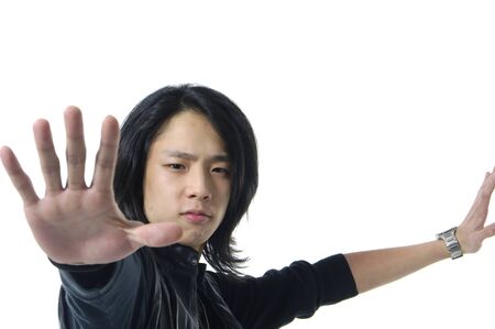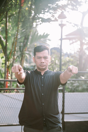 An Asian man with short hair extends both arms directly towards the viewer, making fists. The background consists of greenery, including trees and plants.