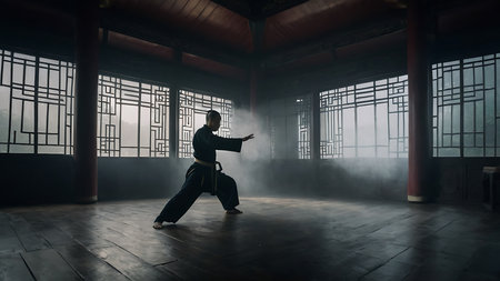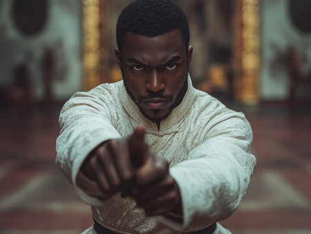 powerful African American athlete practicing tai chi culturally rich gym serene morning light captures graceful essence traditional martial arts.