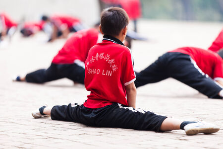ShaoLin, China - October 20, 2011: Shaolin students were doing gymnastics on the street. School children dressed in traditional Shaolin school sportswear.