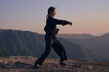 Woman practicing Tai Chi in traditional black outfit on mountain at sunrise, arms outstretched in meditation pose focusing on balance, energy, and mindfulness in nature.