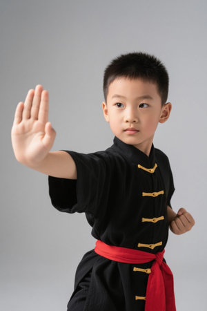A determined young boy in a karate gi with a black belt performs a powerful punch, showcasing discipline and strength. this image is ideal for themes of martial arts, training, and self defense.