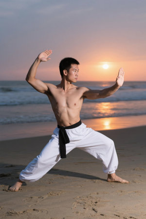 A group of individuals demonstrating karate moves with precision and skill on a sandy beach, Focus on the precision and skill required for a successful kick