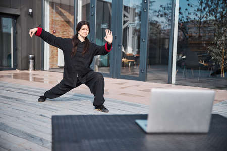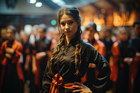 A young woman with a black belt coaches in martial art outdoor bamboo background