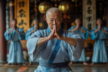 Senior kung fu master meditating with hands together in a traditional temple, with students practicing in the background
