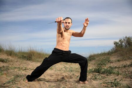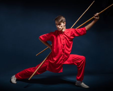 Shaolin warriors wushoo man in red practice martial art outdoor. Kung fu