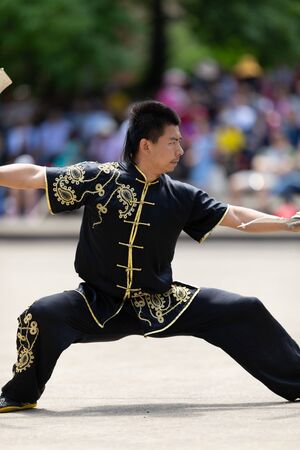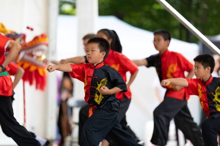 Columbus, Ohio, USA - May 26, 2019: Columbus Asian Festival, Franklin Park, Boy and Girls wearing traditional chinese clothing practicing Kung Fu