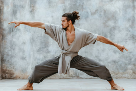 Young man demonstrating strength and flexibility while performing the warrior II yoga pose against a simple concrete background