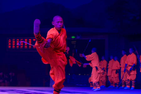 Shaolin, Luoyang, Henan Province / China - January 4 2016: Shaolin Kung Fu Demonstration by young apprentices at the Shaolin Temple in Luoyang, China
