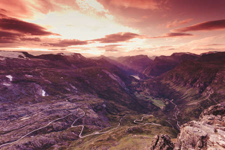 View towards the Geirangervegen, a scenic mountain road near Geiranger, in Norway