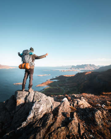 Healthy young man happy traveler tourist standing on top of a rock high in the mountains, enjoying the natural beauty in the morning light. Scandinavia and Arctic background with snow and glacier. Concept of active healthy lifestyle adventure journey vacations.