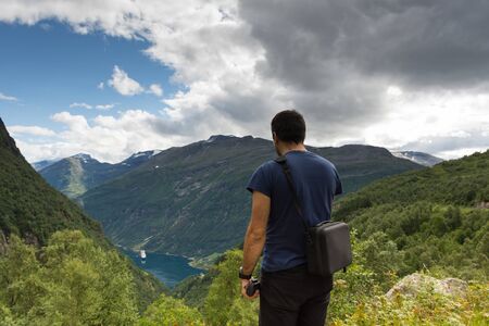 Caucasian male tourist looking towards the Geiranger fjord, in Norway