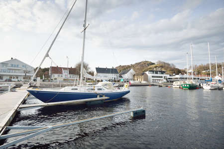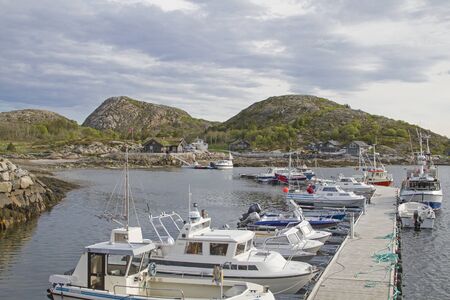 Motorboats, yachts, sailing and fishing boats moored to a pier in a small village in fjords. Rogaland region, Norway. Traditional architecture. Dramatic sky. Travel destinations, cruise, recreation
