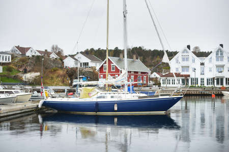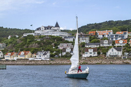Yacht under Norwegian flag leaving the marina of Swedish fishermen village.