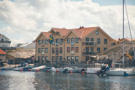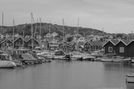 Bovallstrand, Sweden - July 2020: Colorful facades of Swedish summerhouse and sailing boats in harbour in archepelago of West coast Sweden, Bovallstrand by the Sea.