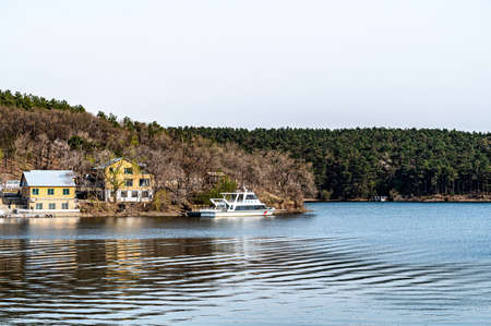 Stockholm, Sweden - May 1, 2019 : Baltic sea landscape, small boat near shore line. Local privat transport, tourism concept, spring nature, selective focus