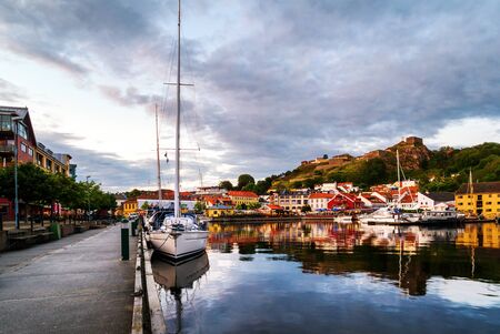 View of the illuminated houses and yachts with Fredriksted fortress at the background in Halden, Norway